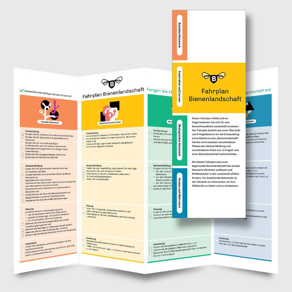 Dieser Fahrplan richtet sich an Organisationen, die sich für eine bienenfreundliche Landschaft einsetzen. Der Fahrplan besteht aus einer Übersicht von Erfolgsfaktoren für die Umwandlung eines Gebiets in eine „Bienenlandschaft“. Es wird zwischen verschiedenen Phasen der Vernetzung und verschiedenen Arten von „Erträgen“ aus einer Bienenlandschaft unterschieden.