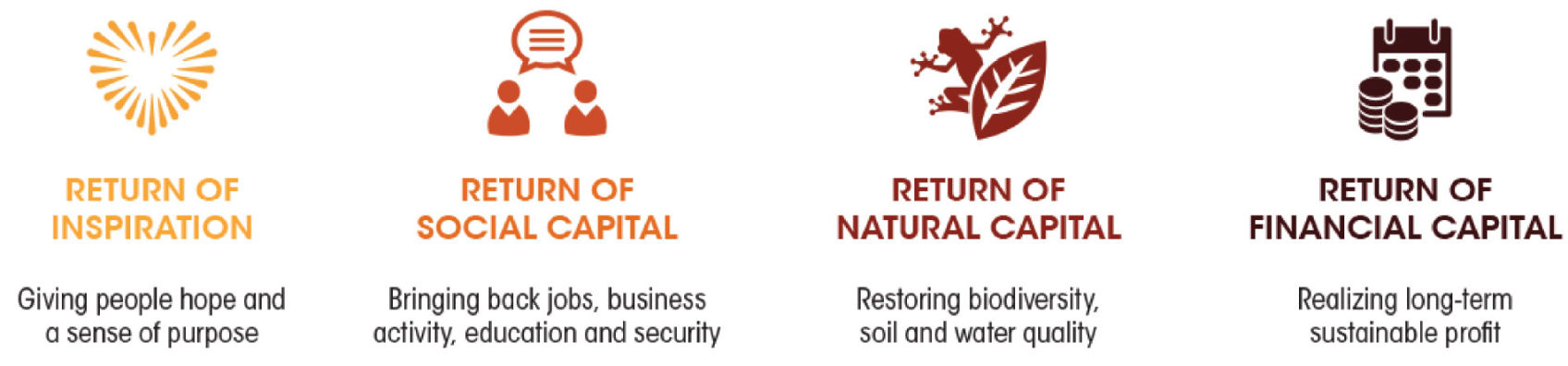 Mit diesem Modell fördert die Organisation Commonland die Wiederherstellung der Landschaft innerhalb einer einzigen Generation (zwanzig Jahre). Die vier Erträge bestehen aus: Naturkapital (Artenvielfalt), Finanzkapital (langfristiger nachhaltiger Gewinn), Sozialkapital (Arbeitsplätze, Sicherheit, Bildung, Geschäftsaktivitäten) und Inspiration (Hoffnung und Sinnerfüllung). In Anlehnung an dieses Modell betrachten wir eine regionale Initiative, die Interessengruppen mobilisiert und eine Bienenlandschaft schafft, als „Sozialkapital“. Wir verstehen den Ertrag von „Finanzkapital“ breiter als nur wirtschaftlich und finanziell; wir berücksichtigen auch soziale Werte, die geschaffen werden können. Beim „Naturkapital“ betrachten wir neben dem Ertrag an biologischer Vielfalt auch günstige Umweltbedingungen und die Bewirtschaftung. In diesem Fahrplan haben wir den Ertrag „Inspiration“ mit Wissensentwicklung, Wissensaustausch und gemeinsamem Lernen gefüllt.