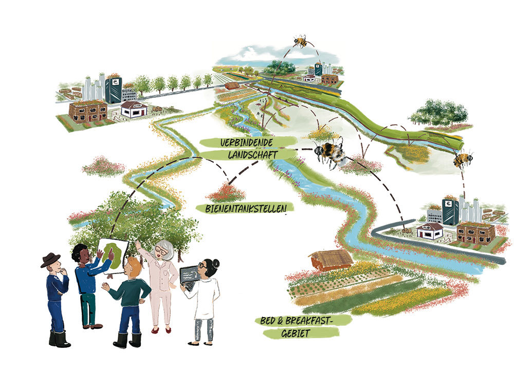 Keine einzelne Organisation kann alleine eine Landschaft in eine „Bienenlandschaft“ verwandeln. Daher ist es wichtig, dass mehrere Parteien, die die Landschaft in einem Gebiet verwalten (Unternehmen, Behörden, Naturschutzorganisationen und Bürger), Maßnahmen für Bestäuber ergreifen. Durch die Zusammenarbeit in einem Netzwerk können sie sich gegenseitig inspirieren, einander helfen, Wissen austauschen und Maßnahmen koordinieren, und die Wirksamkeit ihrer Bemühungen für Bestäuber wird viel größer sein.