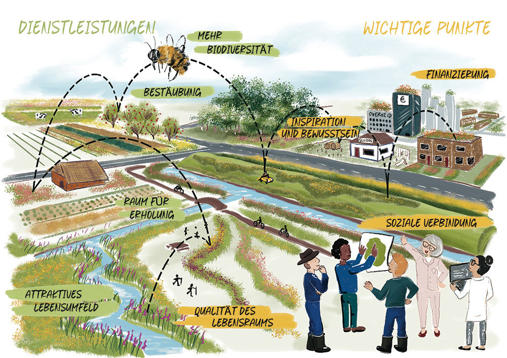 Eine Bienenlandschaft ist nicht nur für die Natur wichtig, sondern auch eine Möglichkeit, Ziele in anderen Bereichen zu erreichen. Überlegen Sie aus verschiedenen Perspektiven, ob und wie eine Bienenlandschaft zu einem sektorspezifischen Ziel beitragen kann. Finden Sie eine Verknüpfung mit den Zielen der öffentlichen Hand, auf nationaler, Landes- oder lokaler Ebene. Durch die Verwendung der „Bienenlandschaft“ als verbindendes Konzept wird eine ganzheitliche und gehaltvolle Vision geschaffen.